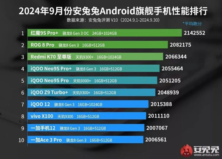 همان‌طور که در فهرست مشاهده می‌کنید، ردمجیک ۹S پرو پلاس این ماه توانسته نیز با کسب امتیاز ۲,۱۴۲,۲۵۲ بهترین گوشی اندرویدی پرچم‌دار بازار لقب بگیرد. رتبه دوم به ایسوس ROG 8 پرو رسیده که ماه گذشته رتبه چهارم را در اختیار داشت. ردمی K70 اولترا نیز با جهش سه‌پله‌ای در رتبه سوم قرار دارد.