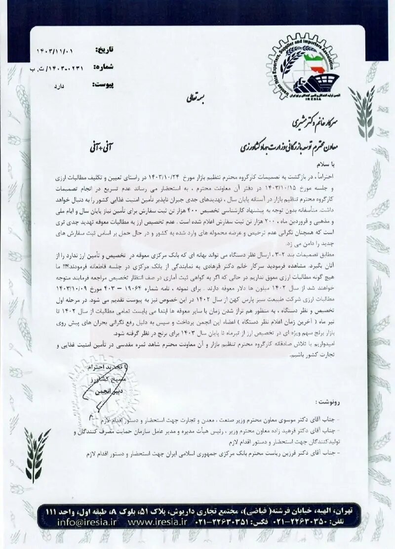 کشاورز ادامه داد: در این خصوص هم متاسفانه تاکنون از سوی بانک مرکزی و وزارت جهاد کشاورزی هیچ اقدامی انجام نشده، لذا مجدد تاکید می‌کنم الویت تخصیص ارز با مطالبات باقیمانده سال۱۴۰۲ شرکت‌ها تا تیرماه، زمان آخرین تخصیص داده شده و همچنین اختصاص سهمیه تخصیص ارزی ویژه به برنج تا پایان سال ۱۴۰۳ می‌تواند اعتماد را به واردکنندگان برگردانده و تهدید پیش روی عدم ترخیص وعرضه محموله های واردشده و درحال حمل به کشور از محل ثبت سفارش‌های جدید را رفع کند، تعلل جایز نیست و باید پاسخگوی بحران‌های احتمالی کمبود و گرانی پایان سال باشند.