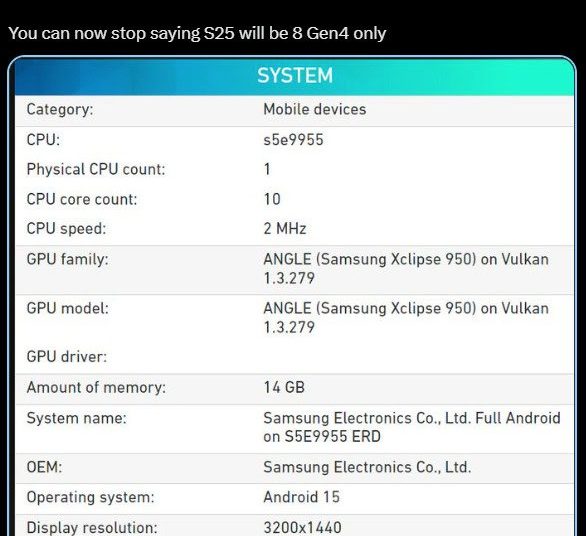 منبعی با نام Theonecid در شبکه اجتماعی ایکس، اسکرینشاتی از برنامه سیستمی کاربردی منتشر کرده که دستگاه سامسونگ مجهز به پردازنده نسل بعدی اگزینوس ۲۵۰۰ را نشان میدهد. این اسکرینشات به پردازندهای با شماره مدل S5E9955، همراه یک پردازنده دههستهای، پردازشگر گرافیکی Xclipse 950، وضوح صفحهنمایش +QHD و اندروید ۱۵ اشاره میکند. منبع گزارش ادعا میکند این اسکرینشات به این معنی است که سری گلکسی S25 با تراشه اگزینوس ۲۵۰۰ در دسترس خواهد بود.