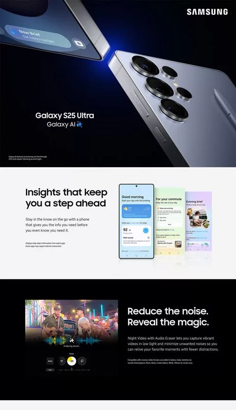 گلکسی S25 اولترا با قابلیتهای منحصربهفردی مانند «ProScaler» عرضه خواهد شد که تصاویر را واضحتر و زندهتر از همیشه نمایش میدهد. به نظر میرسد این ویژگی به کمک هوش مصنوعی، وضوح و شفافیت تصاویر را ارتقا میدهد. این مدل همچنین از قابلیتهایی مثل Now Bar Daily Briefing و Night Video همراه Audio Eraser بهره میبرد که در تمامی مدلهای سری S25 در دسترس خواهد بود.