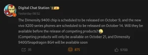 خبرگزاری هامونیه گوشیهای سری X200 ویوو انتظار میرود دارای تراشه مدیاتک دایمنسیتی ۹۴۰۰ باشند. این گوشیها قرار است در ۱۴ اکتبر (۲۳ مهر ۱۴۰۳) معرفی