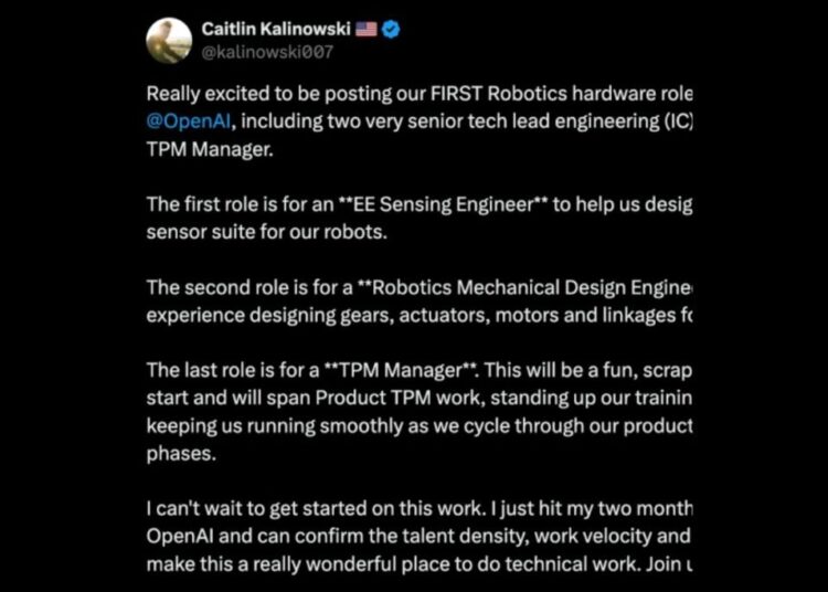 براساس پست «کیتلین کالینووسکی»، مدیر سختافزار OpenAI، در شبکه اجتماعی ایکس، OpenAI روی توسعه رباتهای چندمنظوره که میتوانند با هوش انسانی در محیطهای واقعی کار کنند، تمرکز کرده است. این رباتها را حسگرها و مدلهای هوش مصنوعی اختصاصی تغذیه خواهند کرد.